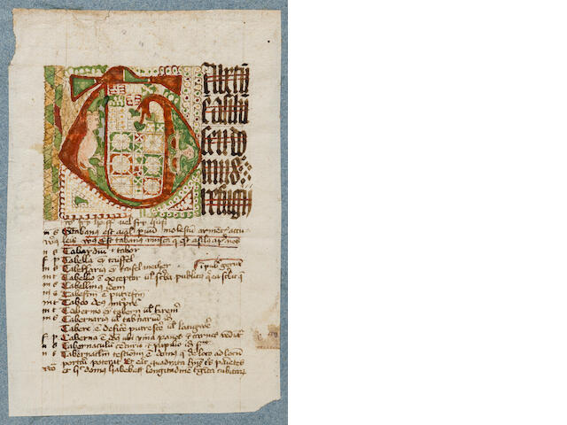 Mit diesen Diebstählen haben die beiden bei Bonhams angebotenen Blätter (aus dem Buchstabenbereich T) aus einer 'Ex quo'-Handschrift der Mainzer Stadtbibliothek (Hs. I 606) nichts zu tun! Dass in dieser Mainzer Handschrift wegen Blattverlust die Lemmata nach "Succentor" fehlen, ist bereits in der Einleitung zur 1988 erschienenen Ex quo-Ausgabe (TTG 22) wie auch in Grubmüllers 1968 erschienenen Untersuchungen (MTU 17) dokumentiert. Diefenbachs online zugänglichem 'Glossarium' aus dem Jahr 1857 kann man sogar entnehmen, dass der auf "Succentor" folgende Buchstabenteil bereits 1857 in der Mainzer Handschrift fehlte!
